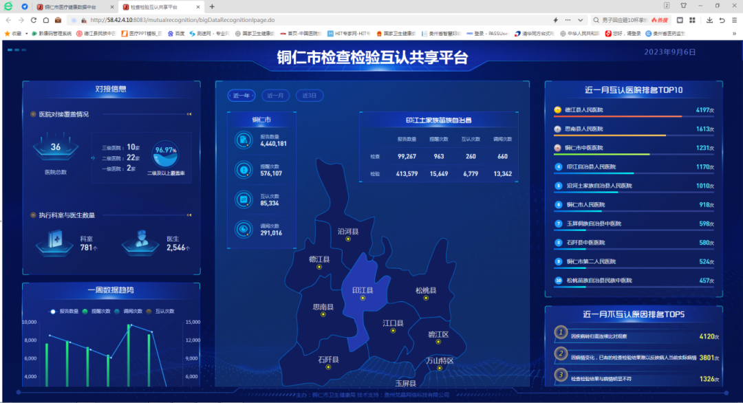 铜仁市积极推进医学检查检验结果互认过程中,依托医疗健康数据中台,建成医学检查检验结果共享互认平台,实现全市所有公立医疗机构检查图像数据、检验数据以及诊断结论等自动采集、动态更新、互通共享。目前,已推动辖区内10家三级公立医疗机构、24家二级公立医疗机构(含2家乡镇卫生院)间共享互认,接入率达100%。